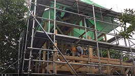 - 高所での安全な作業を徹底 日本の現場を想定した実習場にて、正しい安全装備の装着、運搬方法を身に付けます。また、ヒヤリハット事例を交え、危険行動の予知・回避する徹底的に教育します。